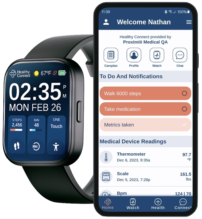 Patients can view their readings on their HealthyConnect App which contains their customized care plan. Their watch tracks their daily steps, heart rate, temperature, and more.